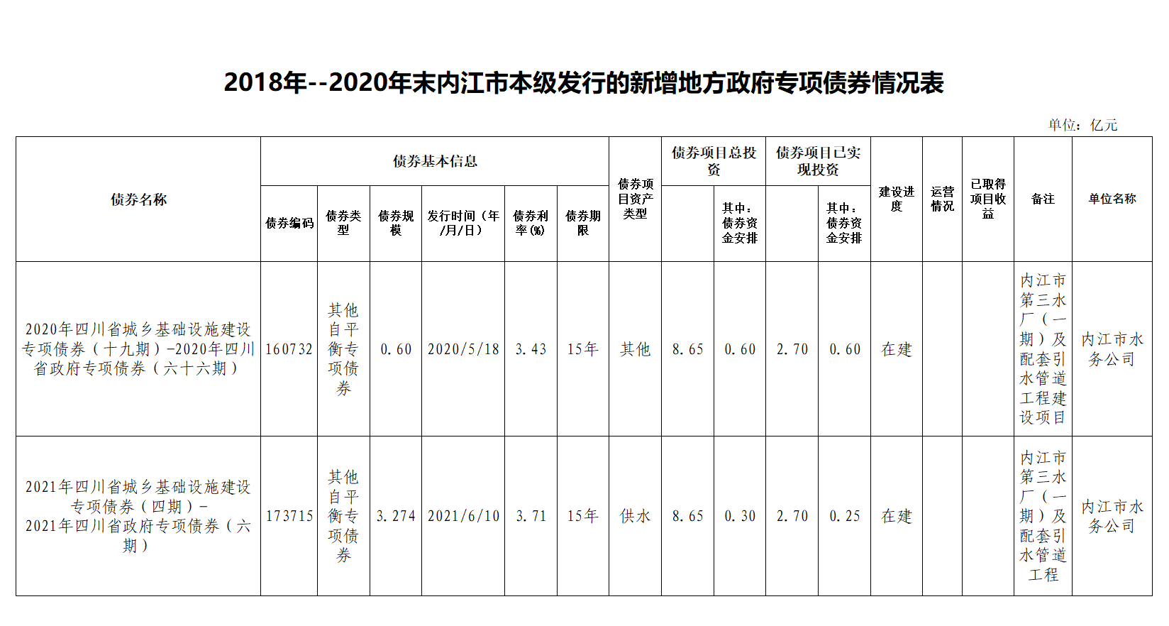 2018年--2020年末內(nèi)江市本級發(fā)行的新增地方政府專項債券情況表
