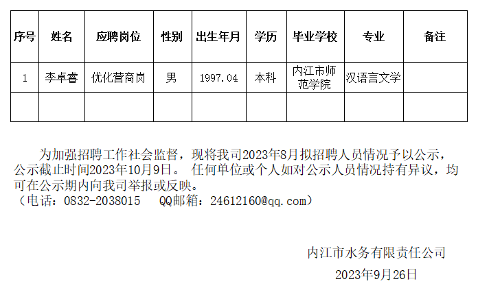 內(nèi)江市水務有限責任公司2023年9月擬招聘人員公示