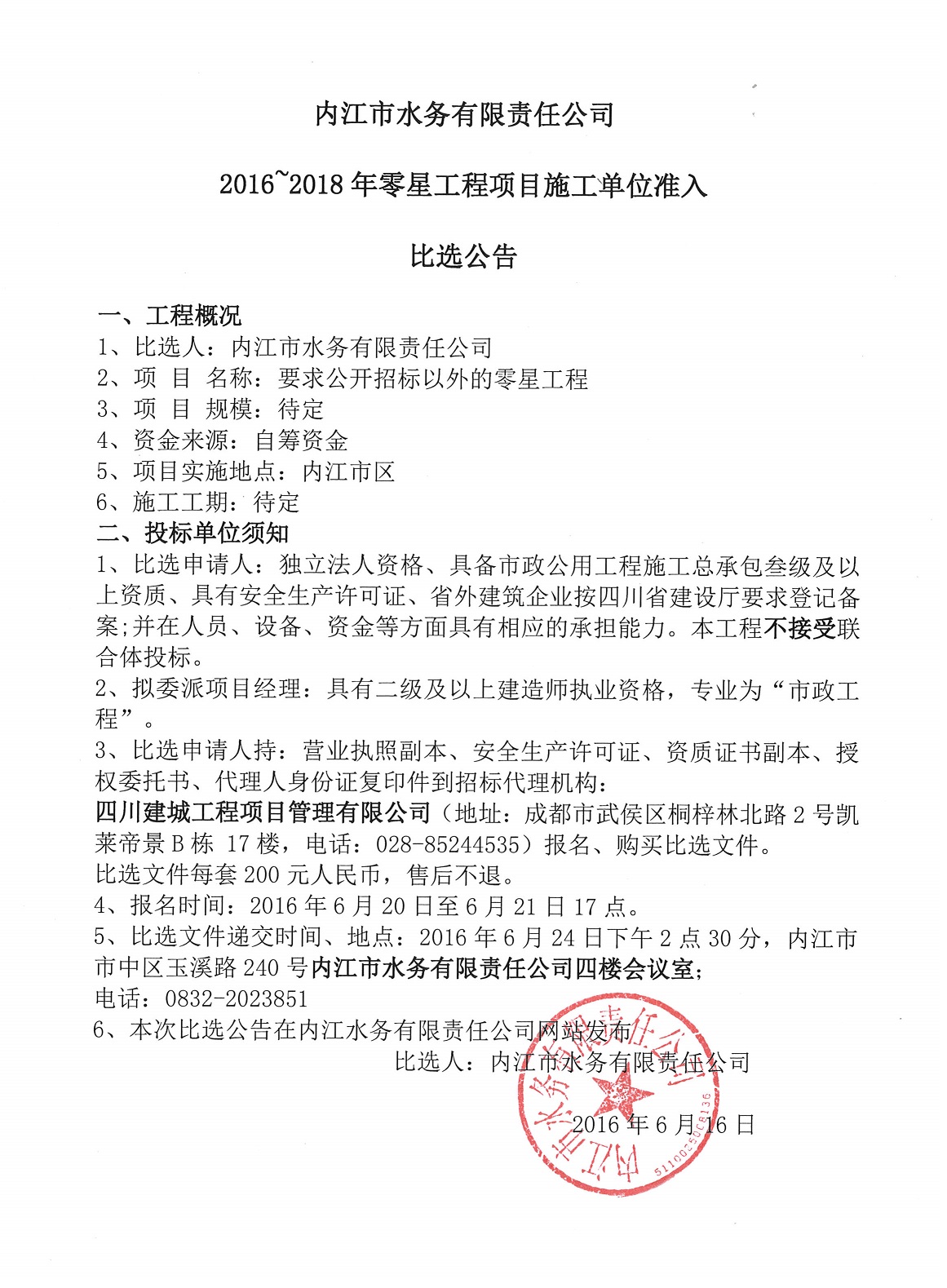 內(nèi)江市水務(wù)有限責(zé)任公司2016~2018年零星工程項目施工單位準入比選公告
