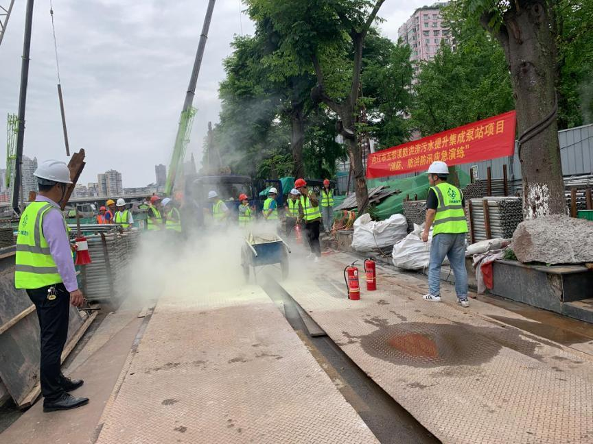 本次演練以上游及本市突降特大暴雨、沱江河水位猛漲、并倒灌鋼板樁圍堰內(nèi)、水位持續(xù)上升、嚴(yán)重威脅現(xiàn)場(chǎng)施工安全為背景。演練過程中,現(xiàn)場(chǎng)作業(yè)人員及搶險(xiǎn)救援人員聽從項(xiàng)目經(jīng)理指揮,協(xié)同配合,現(xiàn)場(chǎng)人員有序撤離,并立即啟動(dòng)排水泵,緊急調(diào)用潛水泵進(jìn)行增援,對(duì)圍堰內(nèi)積水進(jìn)行抽排。