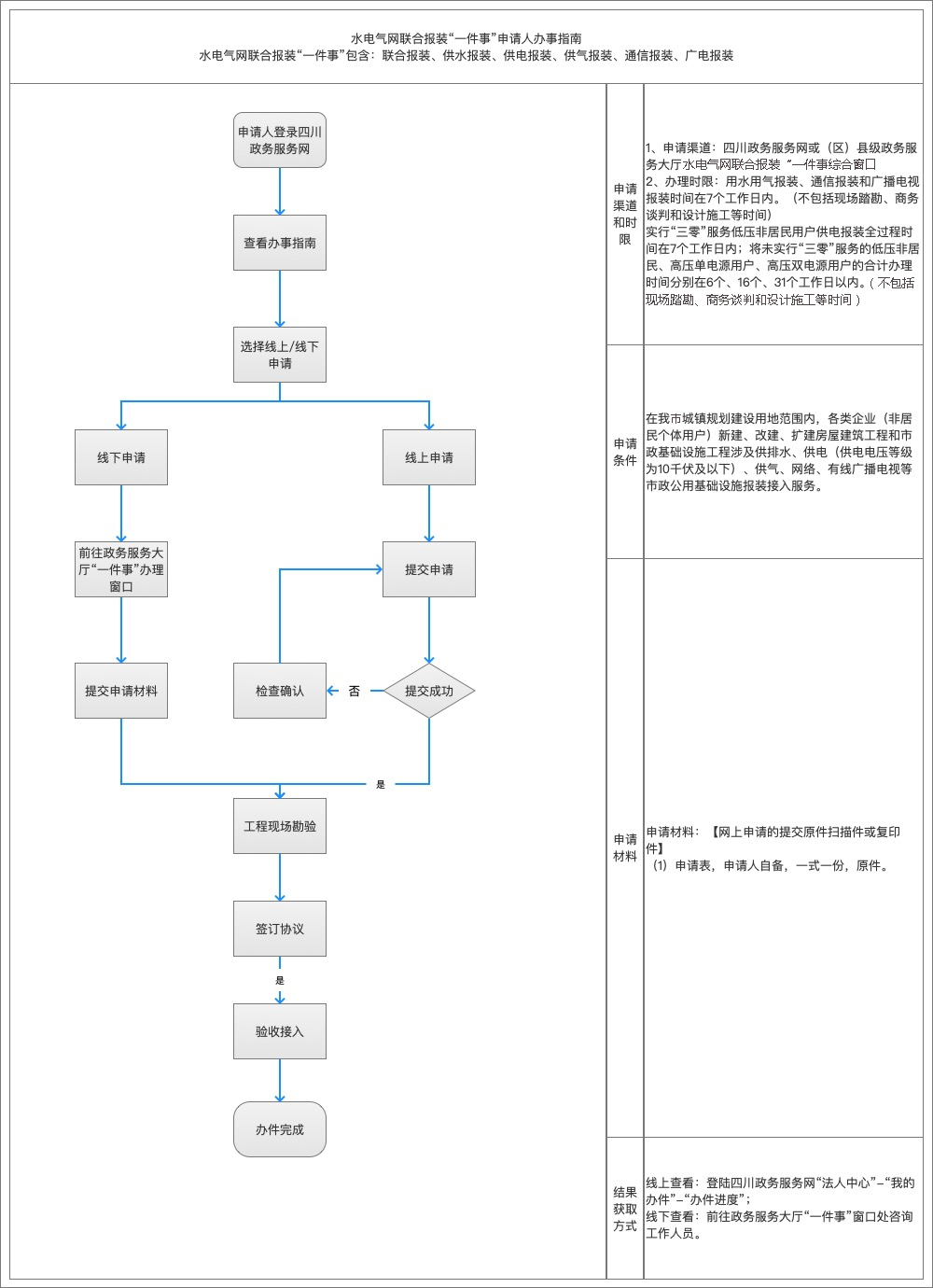 政務(wù)大廳水電氣網(wǎng)聯(lián)合報裝“一件事”綜合窗口辦理或網(wǎng)上申請辦理。